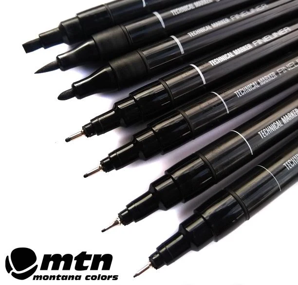 Endlich gibt es die passenden Fineliner von MTN. Die Technical Marker Serie von MTN ist in gewohnter MTN (Montana Colors) Top-Qualität produziert. Hier im 7er Spar-Pack mit einem Preisvorteil gegenüber den Einzelstiften. Von sehr fein 0,1mm bis Brush Tip Marker sind alle wichtigen Strichstärken in diesem Set vereint. Alle Marker sind mit schwarzer Zeichentusche befüllt, ideal für Arbeiten auf Papier zum Outlinen oder für Details.